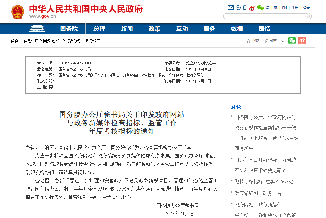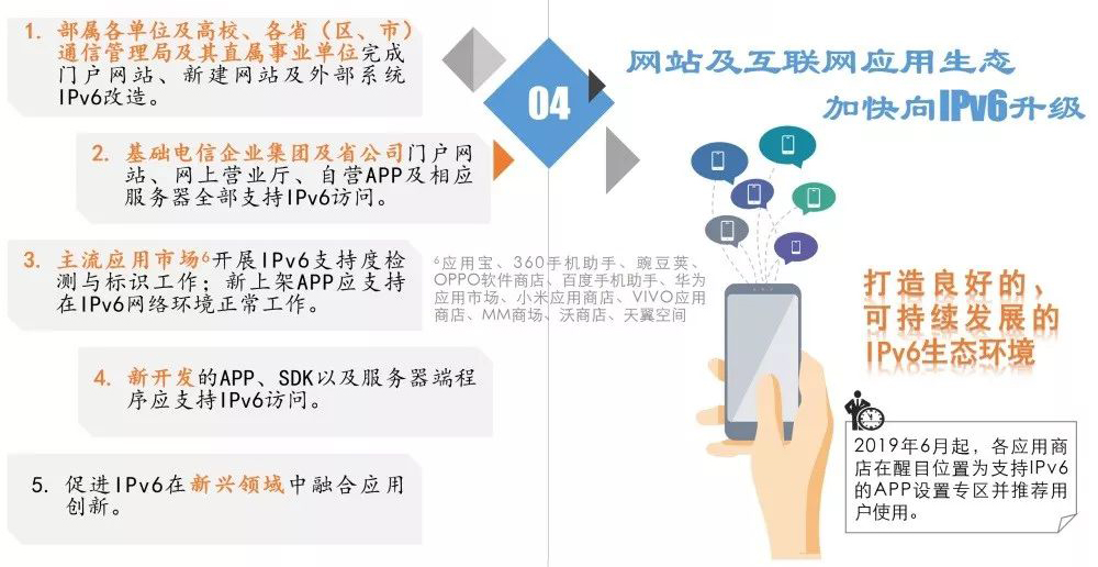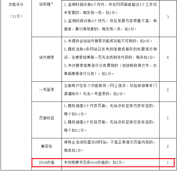 国务院办公厅制定的《政府网站与政务新媒体检查指标》,将IPv6划归到考核机制中,要求网站功能设计必须进行IPv6升级改造。