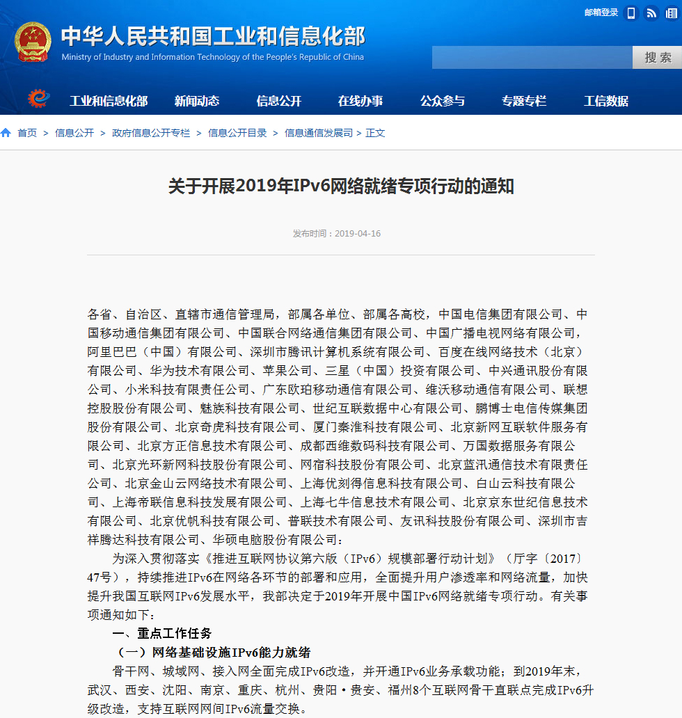 2019年4月,国务院办公厅和工业和信息化部相继发布升级IPv6政府文件,政企部署IPv6箭在弦上,迫在眉睫!