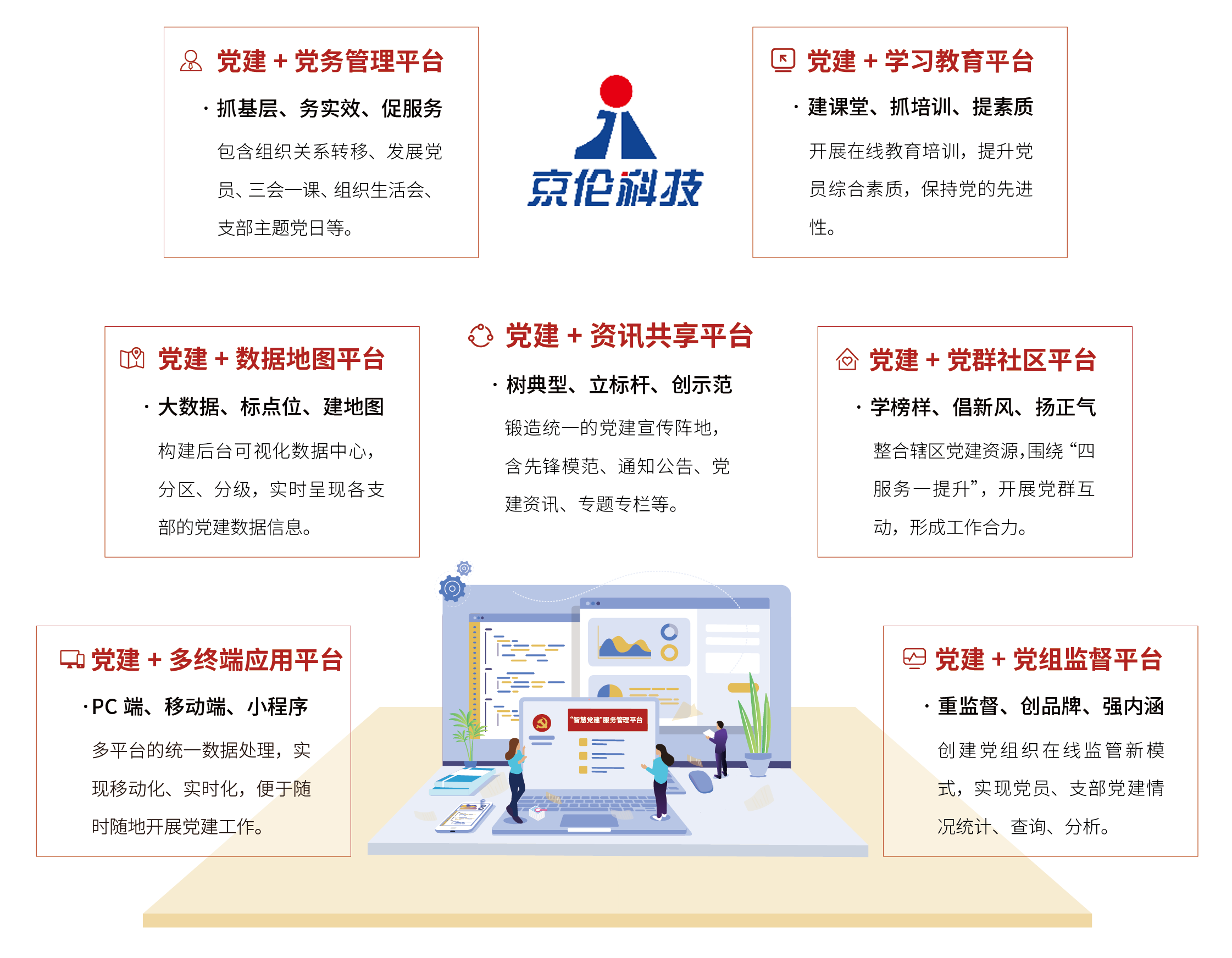 “智慧党建”服务管理平台的“1+6”体系,由1个资讯共享平台搭配6个应用服务平台建立。即汇集党建活动、先锋模范、通知公告、专题专栏等资讯的一个资讯共享平台,搭配“党务管理”、“学习教育”、“数据地图”、“党群社区”、“党组监督”、“多终端应用”六个应用服务平台,构建强大的“1+6”党建宣传阵地及多元化服务平台,创建多点信息交流沟通、数据协同、资源信息共享的智慧党建工作新方式。