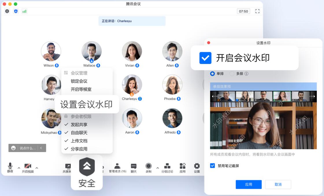 3、支持全局水印,覆盖会议主界面、会议悬浮窗、本地录制文件等所有会议场景,确保会议内容安全无虞。