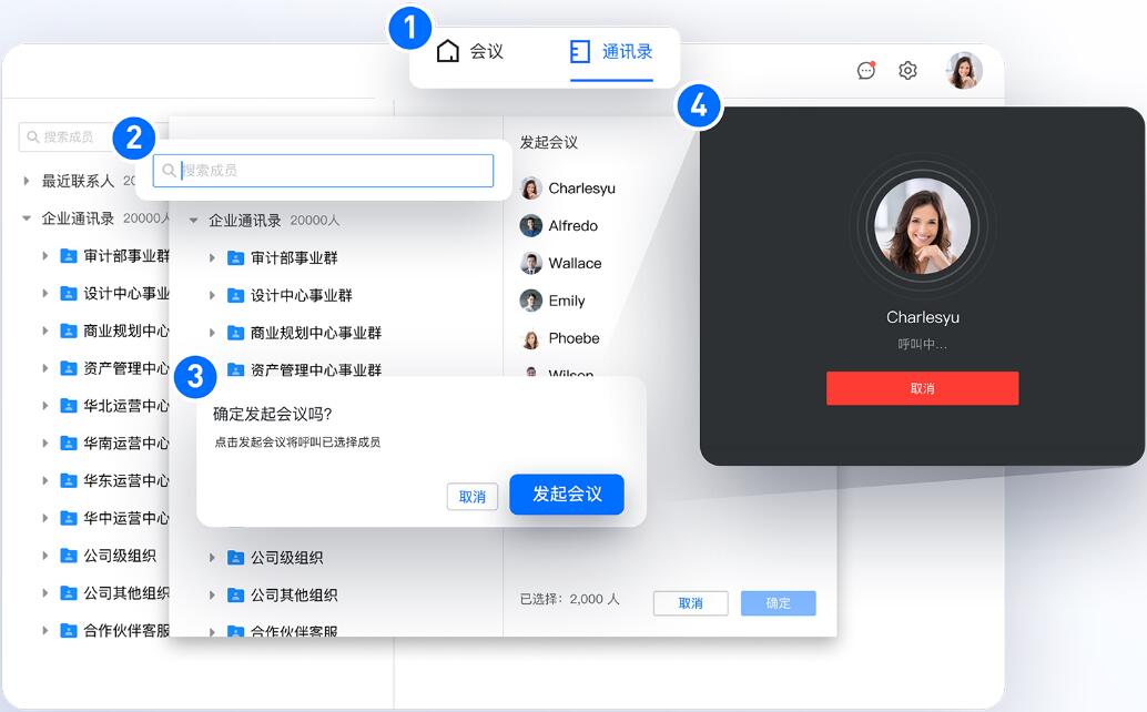 1、通讯录批量邀请,会前消息通知,客户端响铃呼叫功能,让参会者及时收到会议提醒快速入会。