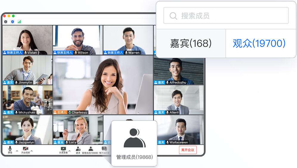 1、支持500、1000、2000方的大房间,2万方网络研讨会(Webinar),满足客户大规模会议需求。