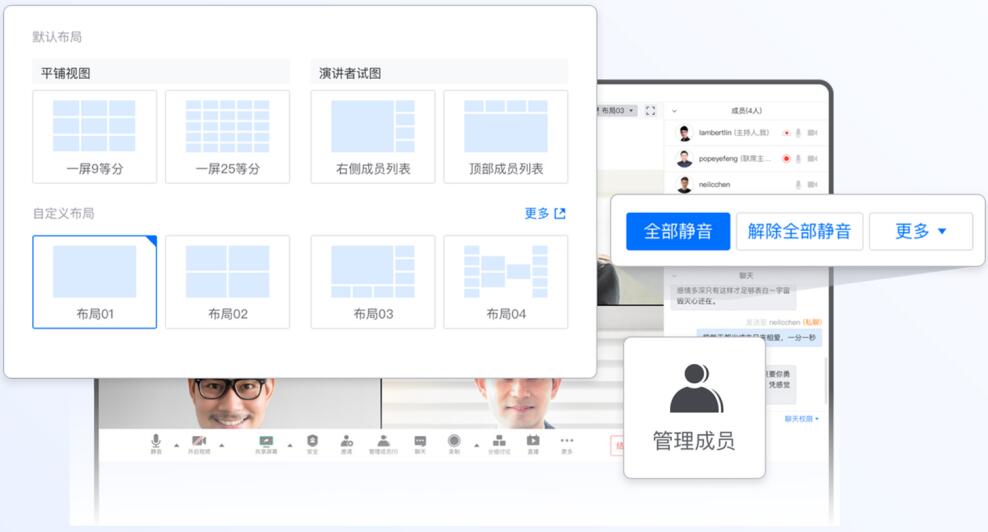 2、企业版用户专享自定义会议布局,“自定义会议布局”,多种模式随心切换,不同场景有序展示。