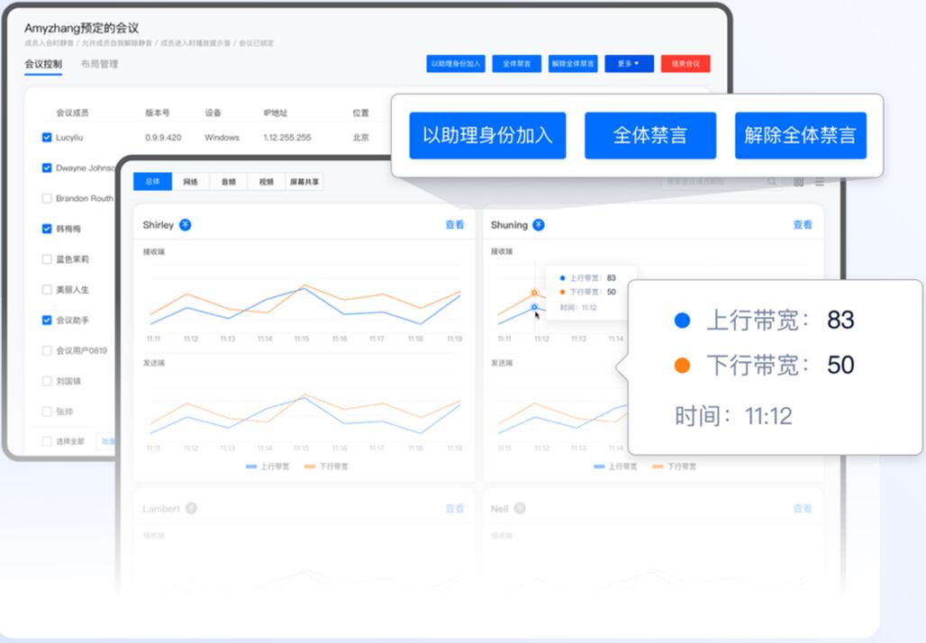 支持企业管理后台,可进行分级分权、会议管理、资源管理、数据统计、质量监控、场外会议控制、自定义布局等,满足用户管理需求。