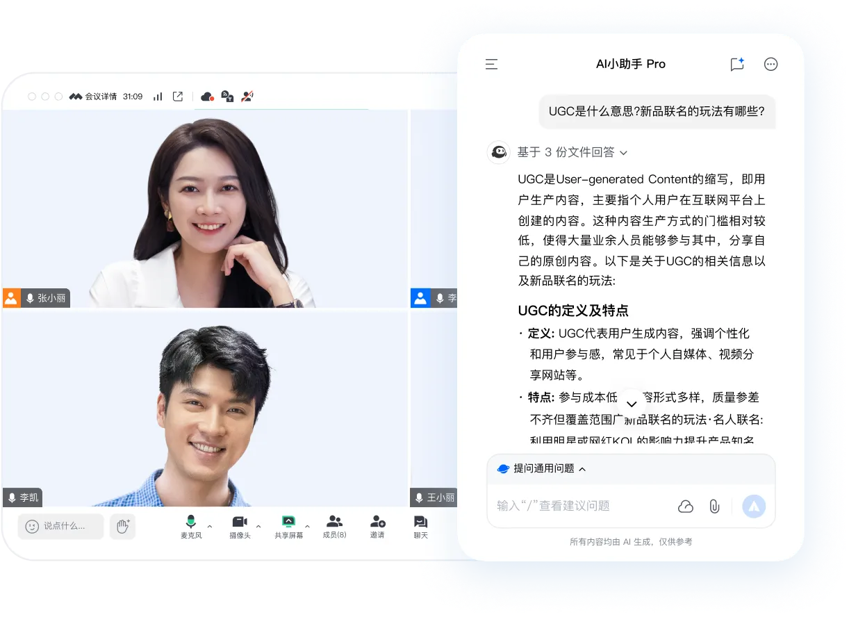 无需铺垫当前会议的背景信息,AI小助手 Pro 根据当前会中的实时讨论进行回答。不必担心走神错过关键信息,为您提炼当前讨论重点;还能整理会议待办,明确待跟进的工作,提升执行力。