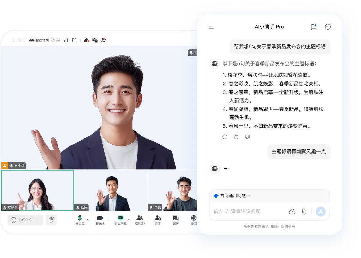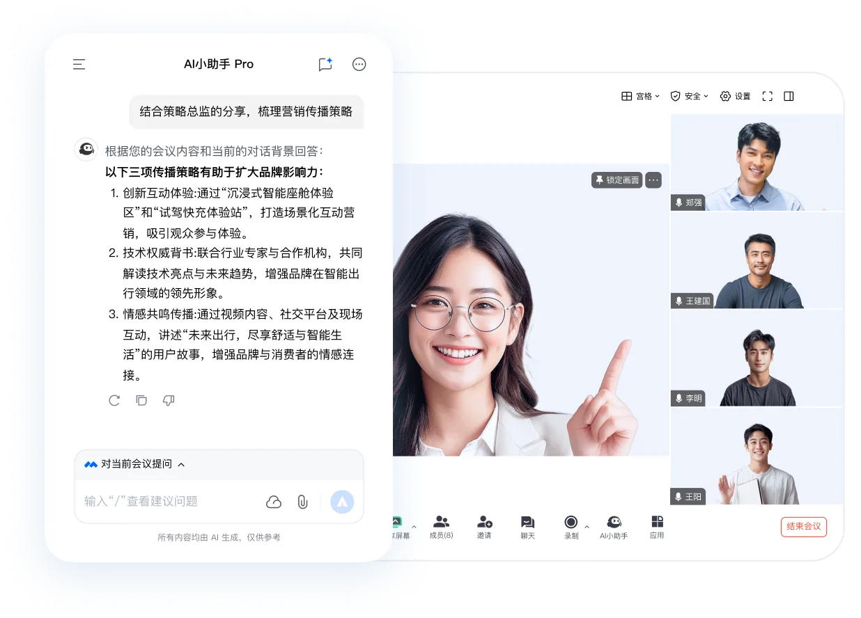 通过简单对话,帮助您在会议前中后的任何时刻都能生成内容大纲、及时补充创意,放大您团队的才华,简化决策过程,并将会议转变为高效、高效和充实的时间利用方式。