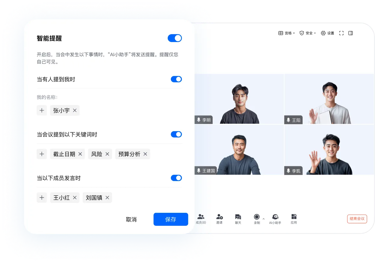 设置提醒项,当有人提到“我”、关注的发言人或者话题时,AI小助手 Pro 给您自动发来提醒,偶尔走神,也能跟上会议节奏。在对话框内持续提问,深入了解重点、难点,轻松高效参会。