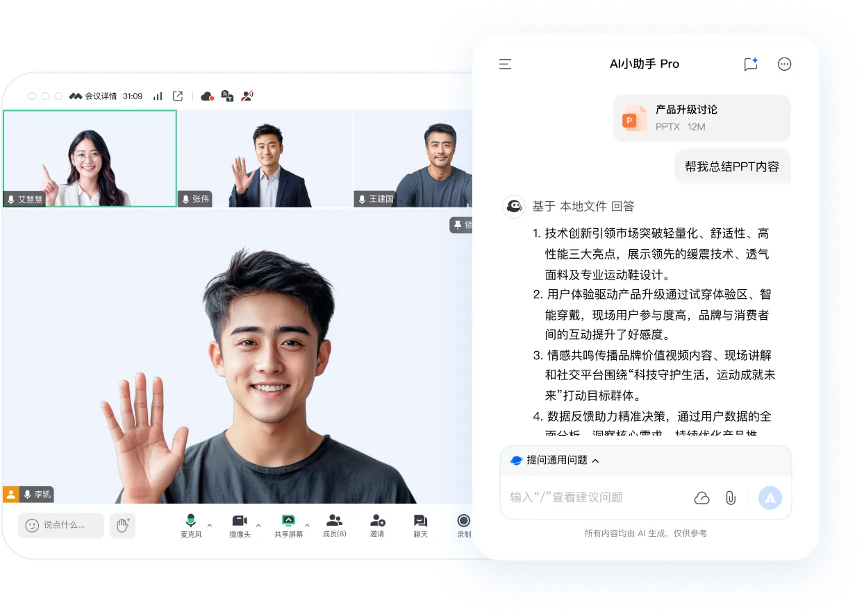 将文件、图片或云录制文件上传至对话框,在会议前、中、后的任何时刻,都能实现文档审查、图像识别、会议内容分析总结,助您高效开会。
