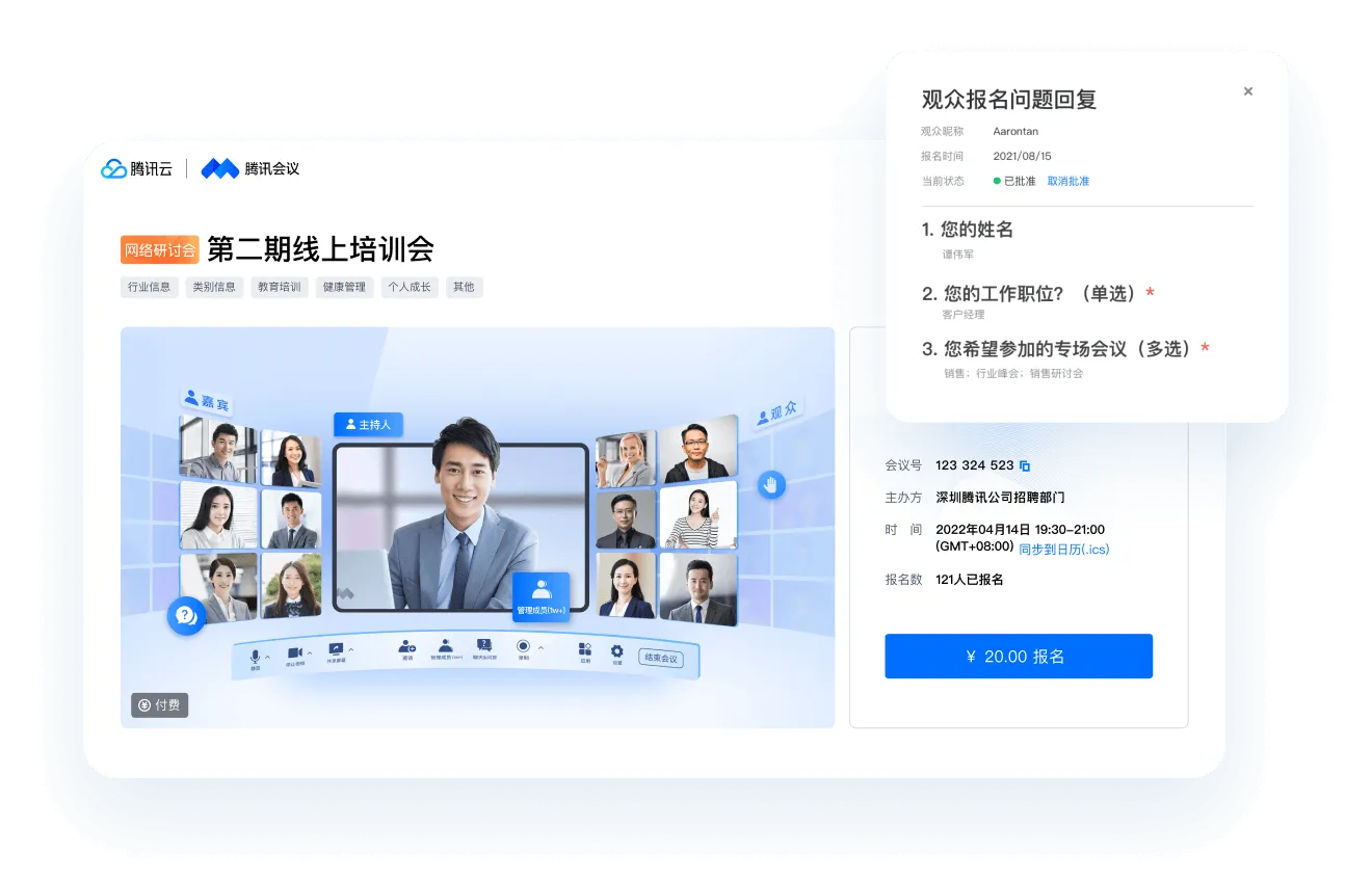 支持设置会前自定义报名规则,报名留资问题,可以自定义门票价格和数量。嘉宾可专属链接免报名入会,支持分来源统计观众报名人数和信息。