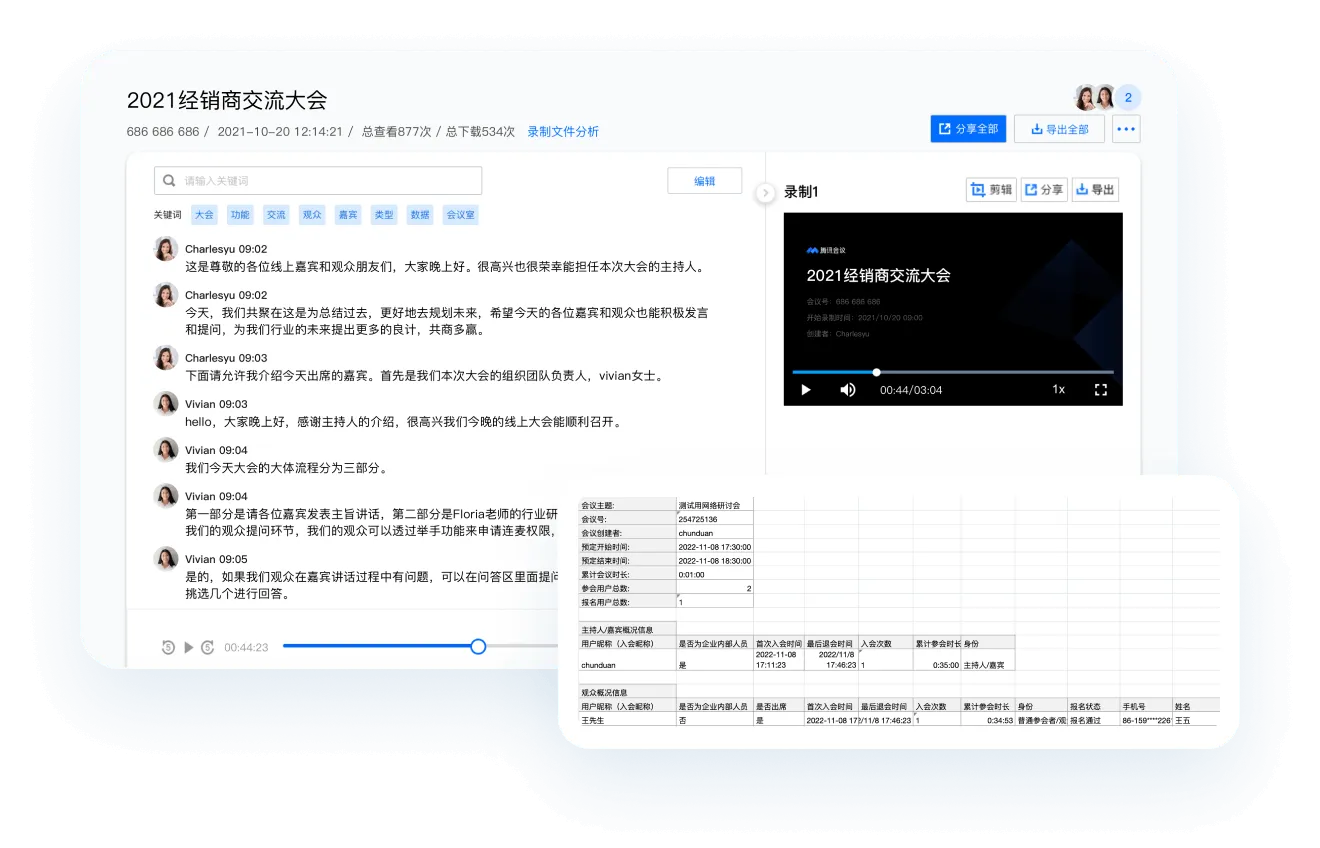 一键开启自动会议纪要,会议全程云端录制,云剪辑快速生成会议集锦,支持导出观众从报名、入会、离会的全链路数据明细,方便识别高意向潜在客户并且建联。