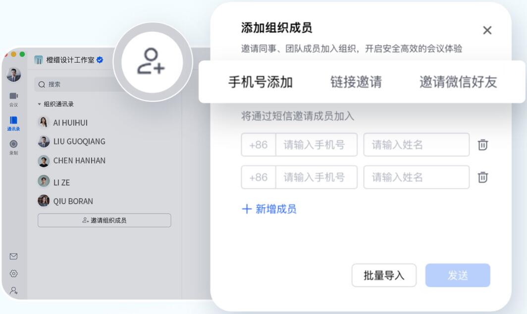 ◎ 腾讯会议APP也为您提供组织管理能力,前往【通讯录】,点击界面右上角的【组织管理】-【添加成员】, 即可邀请。