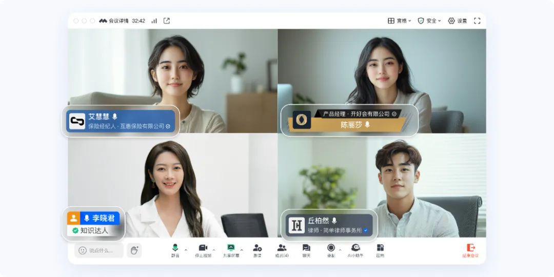 ○ 完成认证后,即可在腾讯会议中同时展示公司名称、职位头衔,让沟通更正式。人员众多时,也能快速识别出对应模块的负责人,还能减少非企业内成员冒名顶替的可能性,让会议更安全。
